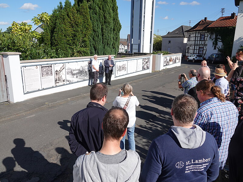 Gleich neben der Lantershofener Kirche steht das Studienhaus Burg Lantershofen, umgeben von einer langen Mauer. Diese wurde nun auf einer Länge von rund 21 Metern entlang der Graf-Blankart-Straße anspruchsvoll gestaltet. Der Förderverein Zukunft Lantershofen, der auch schon den Birnenrundwanderweg um Lantershofen initiierte, hat auf 16 Bildtafeln herausragende Bilder verschwundener Bauwerke, alte Urkunden und Erinnerungen dargestellt. „Es ist eine dauerhafte Präsentation regionaler Dorfgeschichte mit historischen Fotografien. Jede Tafel gibt dem Betrachter den geschichtlichen Hintergrund des dargestellten Objektes wieder“, erklärte der Vereinsvorsitzende Leo Mattuscheck bei der offiziellen Übergabe der Tafeln ans Dorf den Hintergrund.